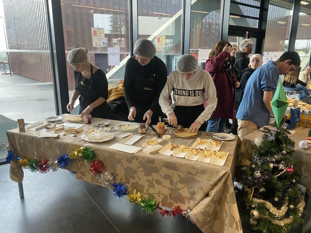« Vendredi 19 décembre, les élèves de T CAP PSR ont organisé leur deuxième vente de crêpes maison. Préparées avec Mme MABILLAIS, elles ont été vendues 0,80 € lors de la récréation du matin, en présence de Mme JOUIS et Mme RECHET, afin de financer les sorties scolaires de fin d’année.